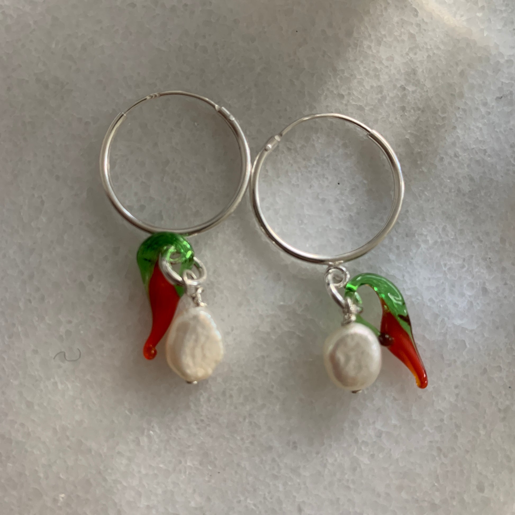Pendientes de plata de ley hechos a mano con un chile de cristal y un dije de perla de plata de ley envuelto a mano, 30 mm