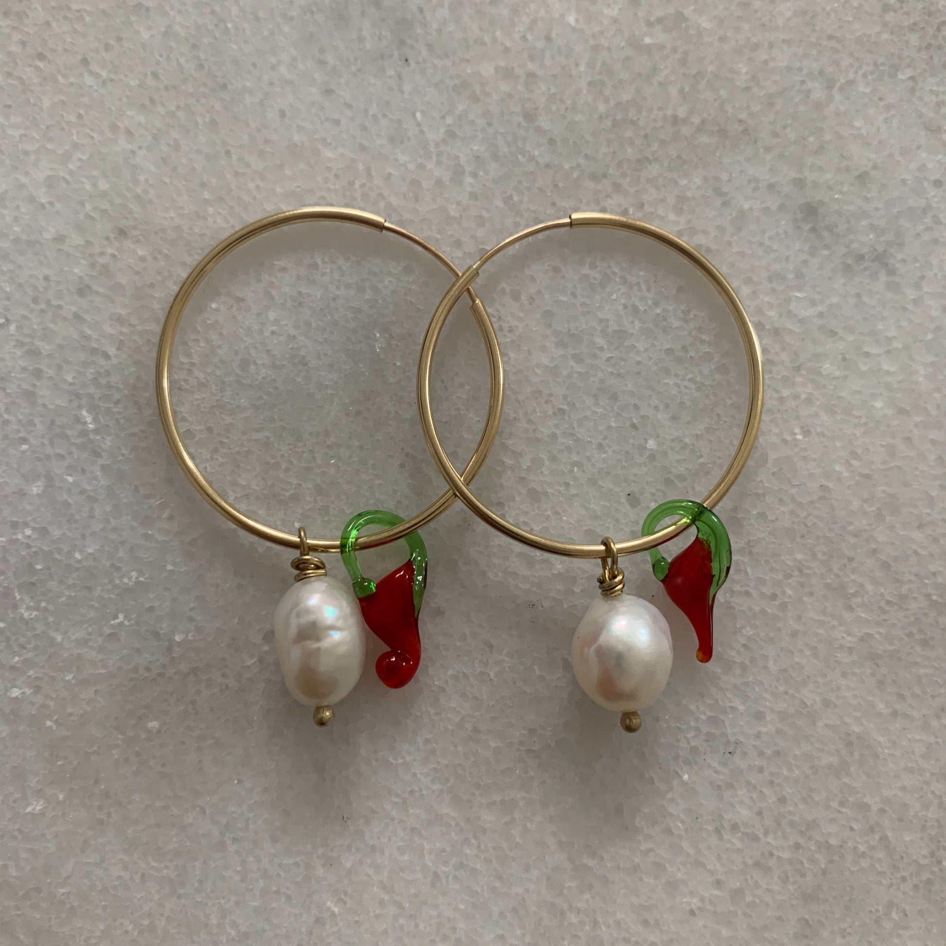 Aros llenos de oro con chiles de vidrio y gotas de perlas en aros llenos de oro de 30 mm