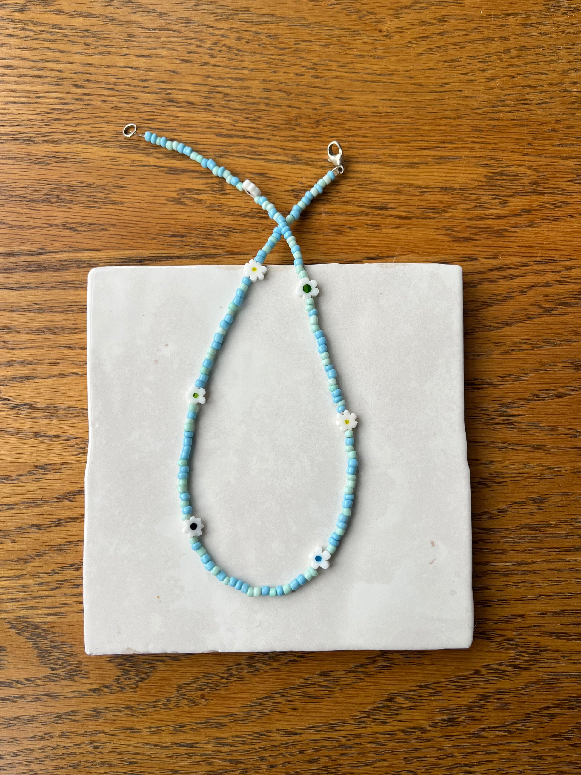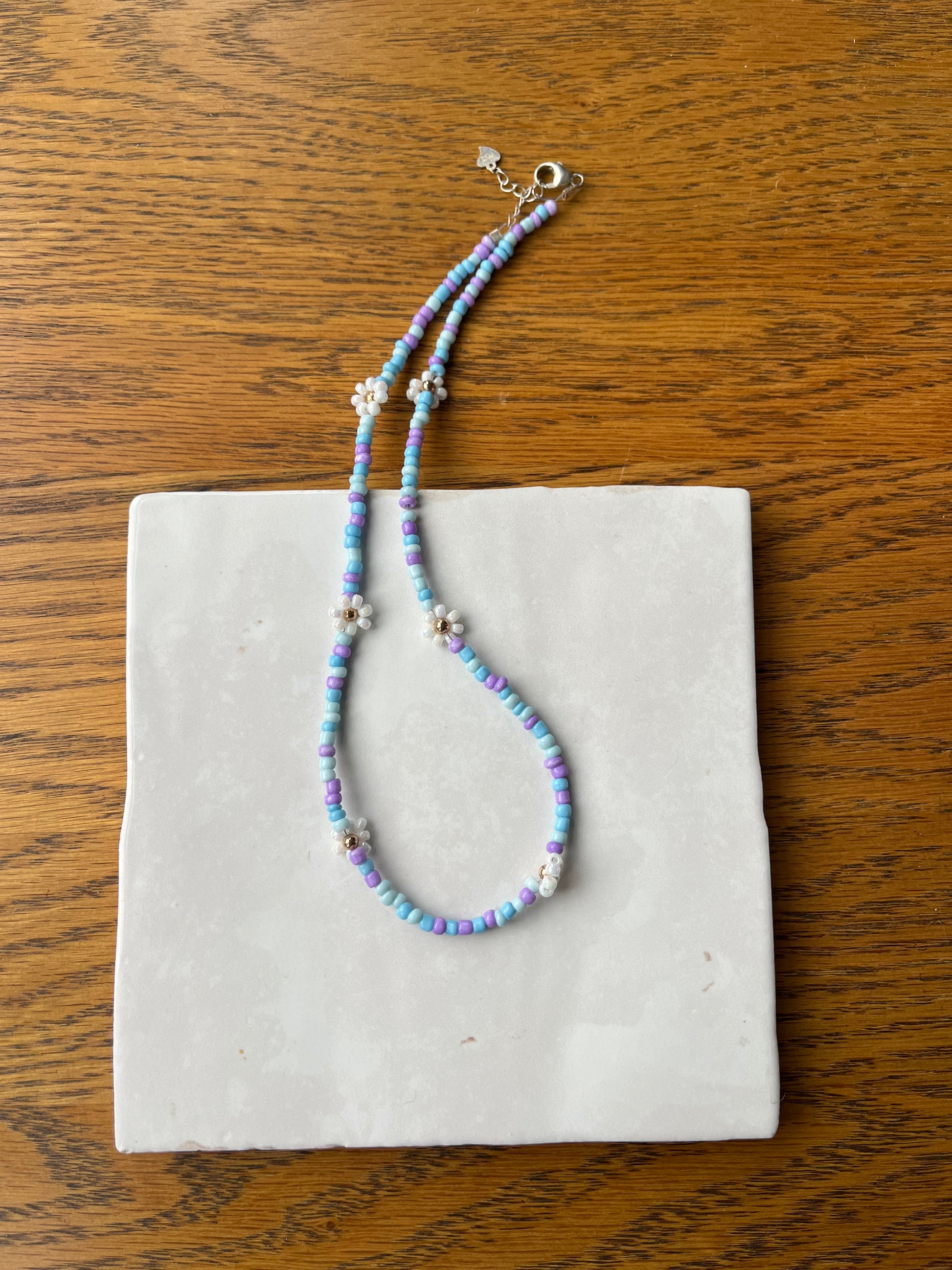 To be worn just longer than a choker, pink glass beads and glass millefiori beads with sterling silver finishes