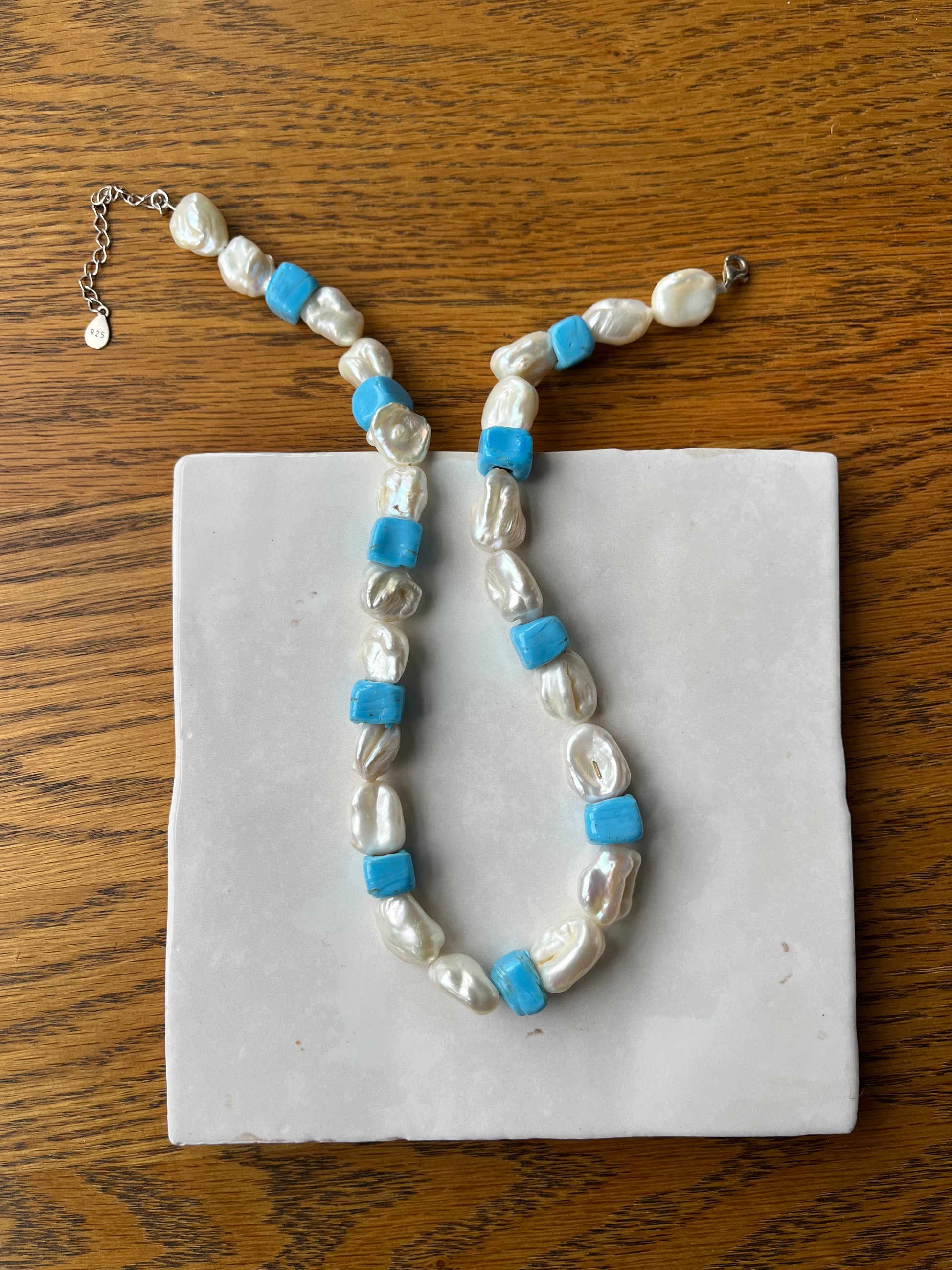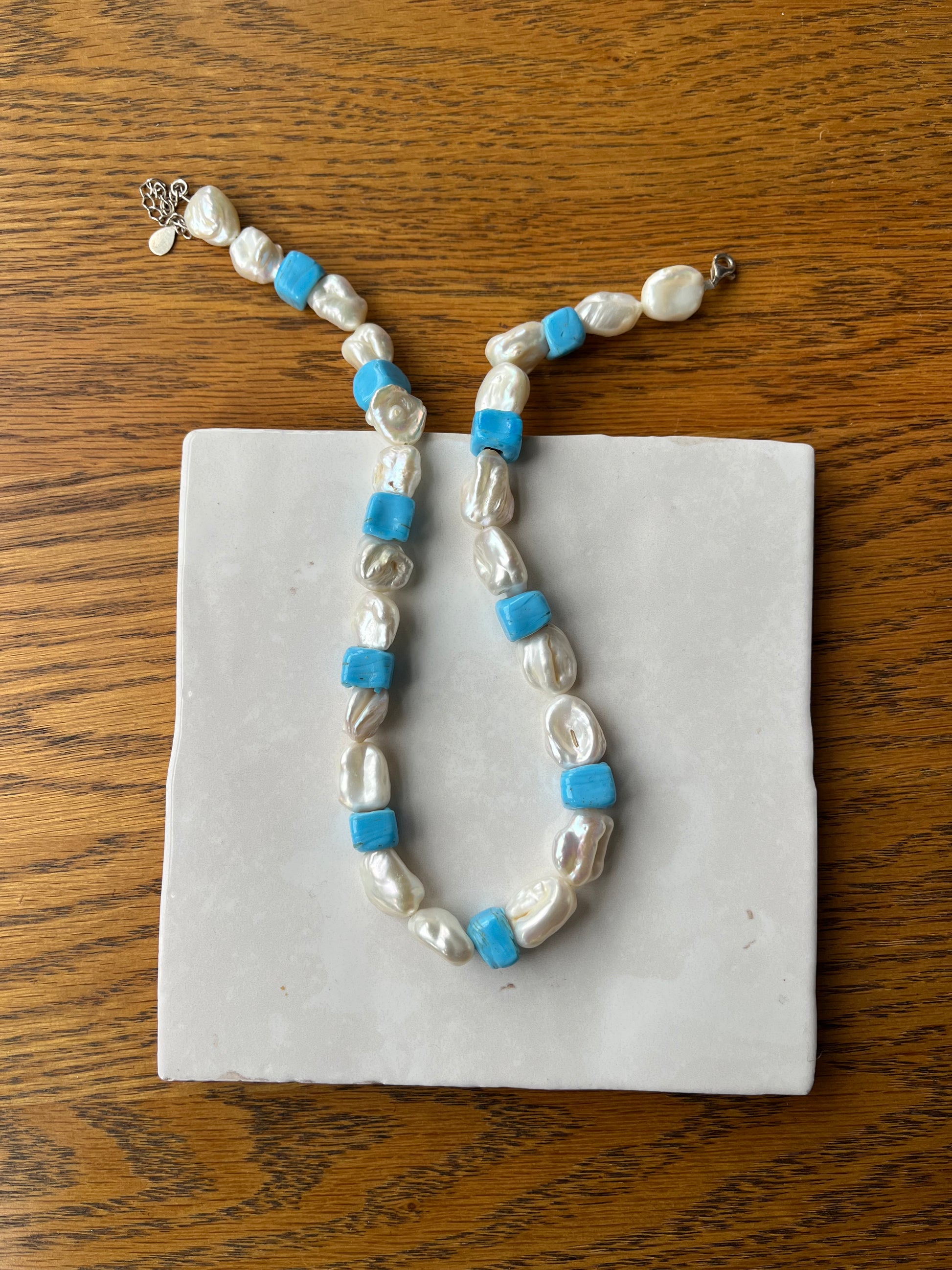 A Beautiful handmade sterling silver, freshwater pearl and handmade ceramic bead necklace. Handmade in London, UK. Reminiscent of Milos in Greece and their gorgeous handmade ceramics!