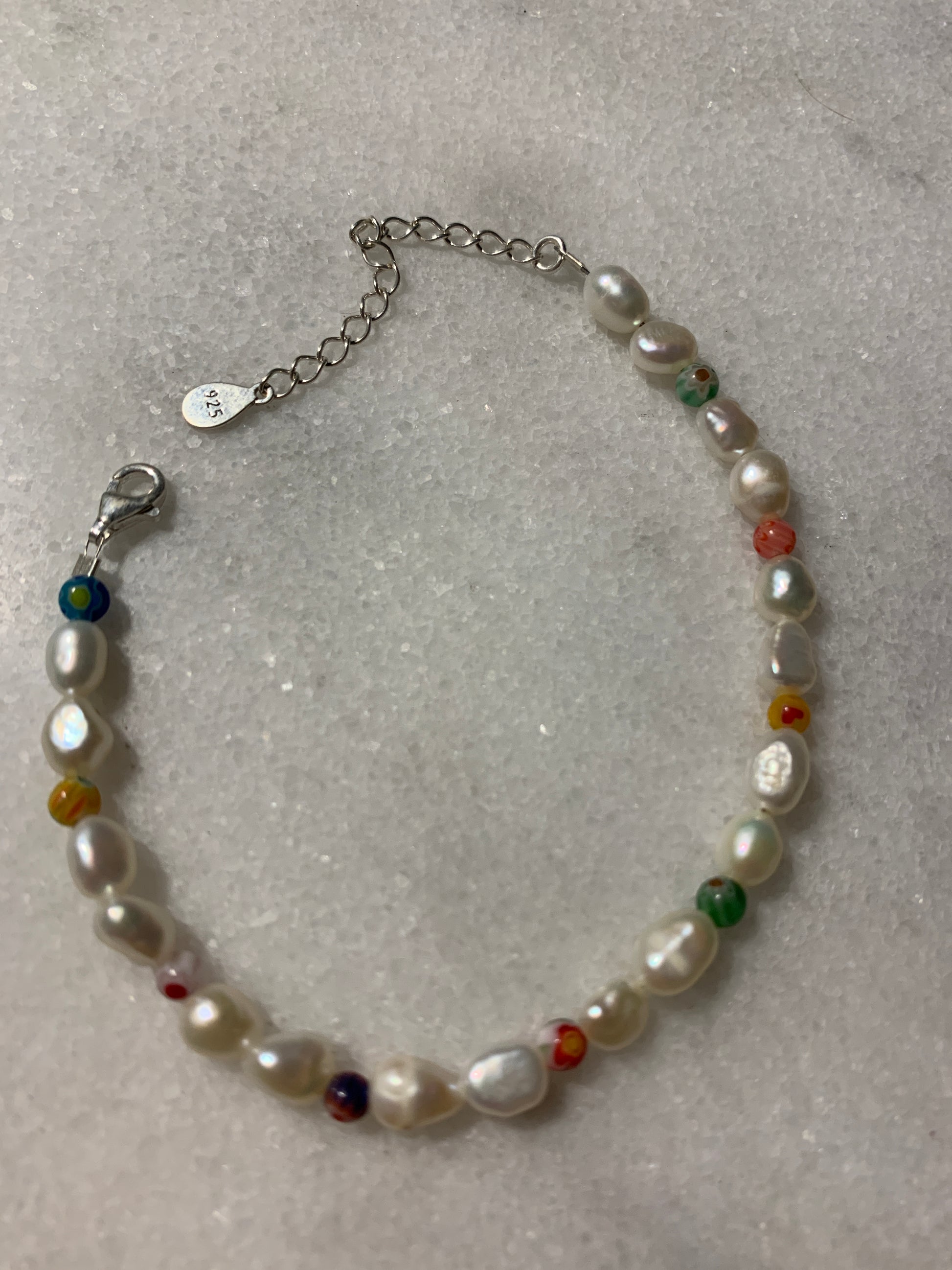 Pulsera de perlas de agua dulce, cristal millefiori y plata de ley