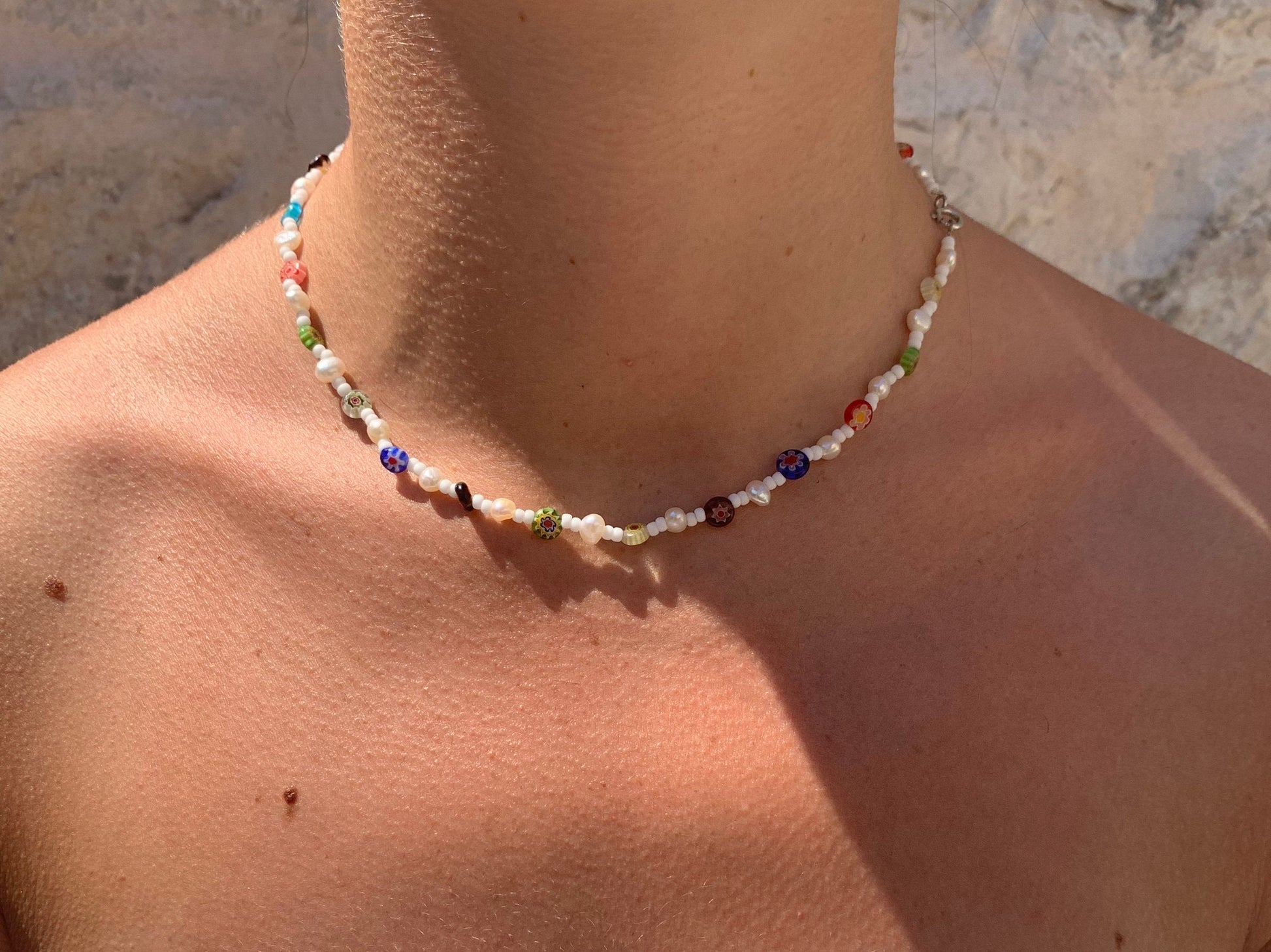 Collar de perlas de agua dulce y cuentas de vidrio hecho con perlas y cuentas millefiori. Cada pieza está hecha a mano en Londres por mí, inspirada en las hermosas cuentas de colores brillantes de Venecia, esta pieza es realmente especial para alegrar el día a día.