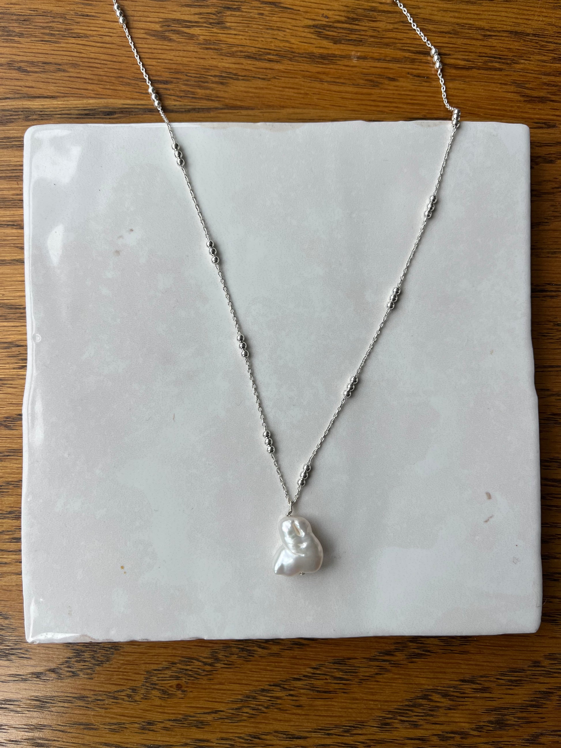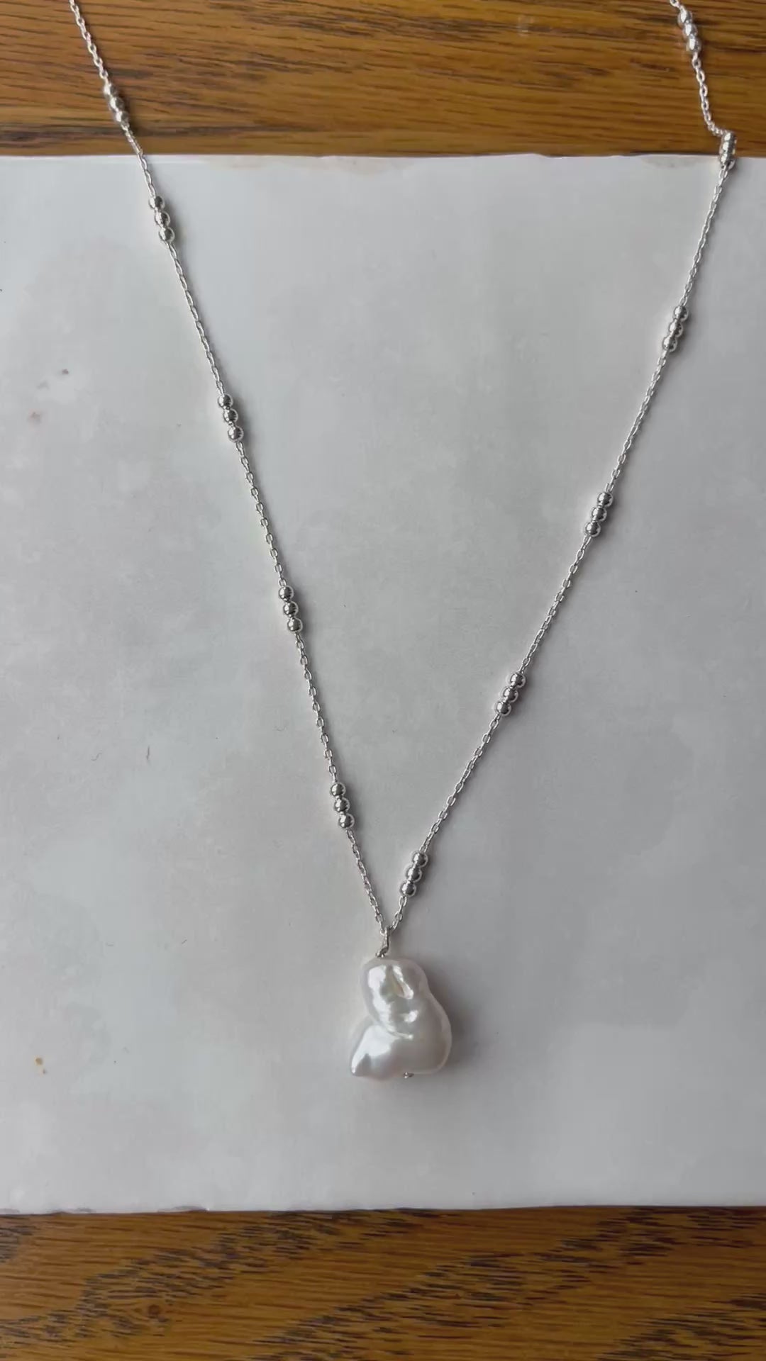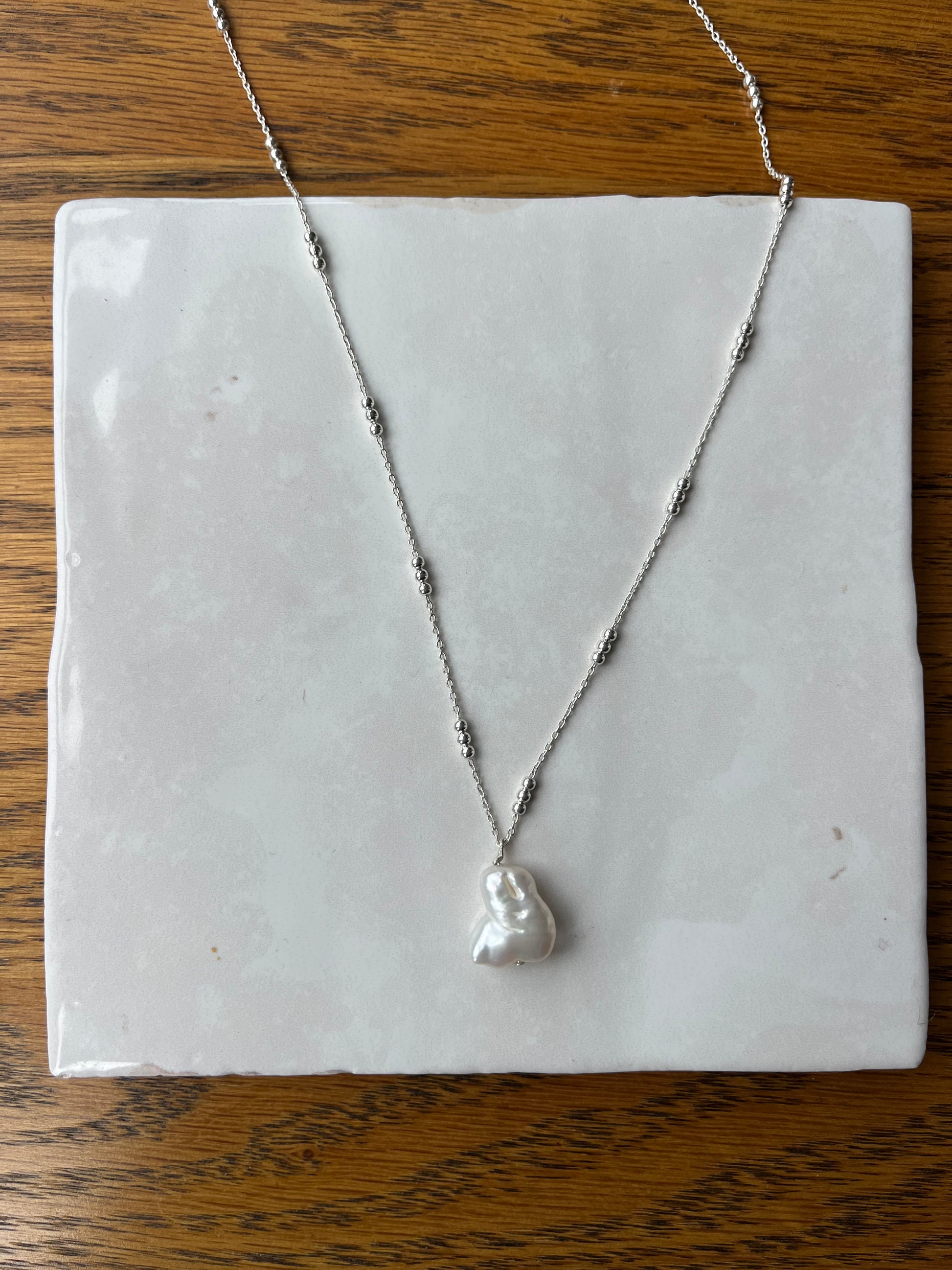 This is a sterling silver necklace with a freshwater pearl drop. The necklace chain length is 17 inches. If you would like a longer or shorter length please drop us a message and we can help.