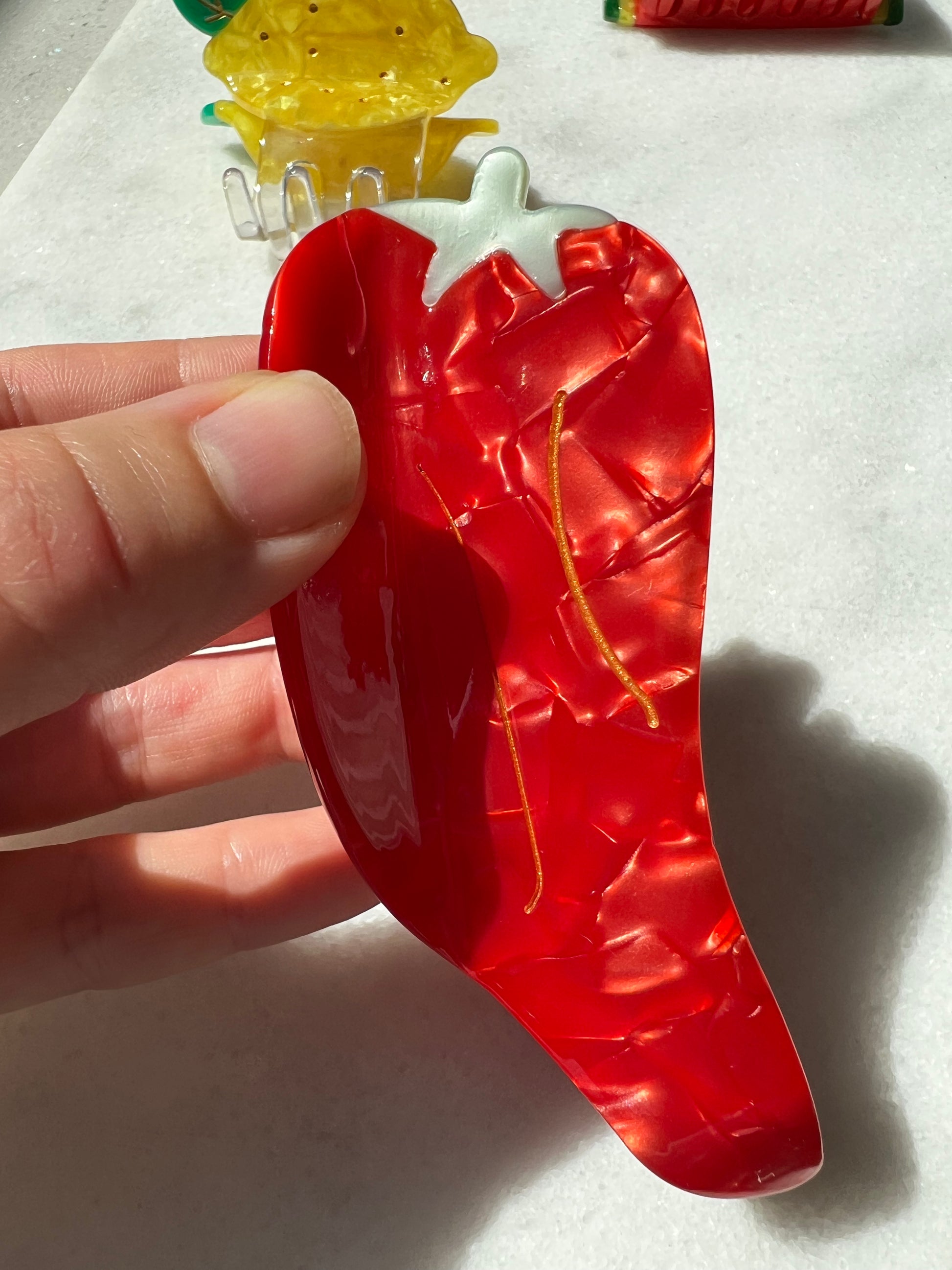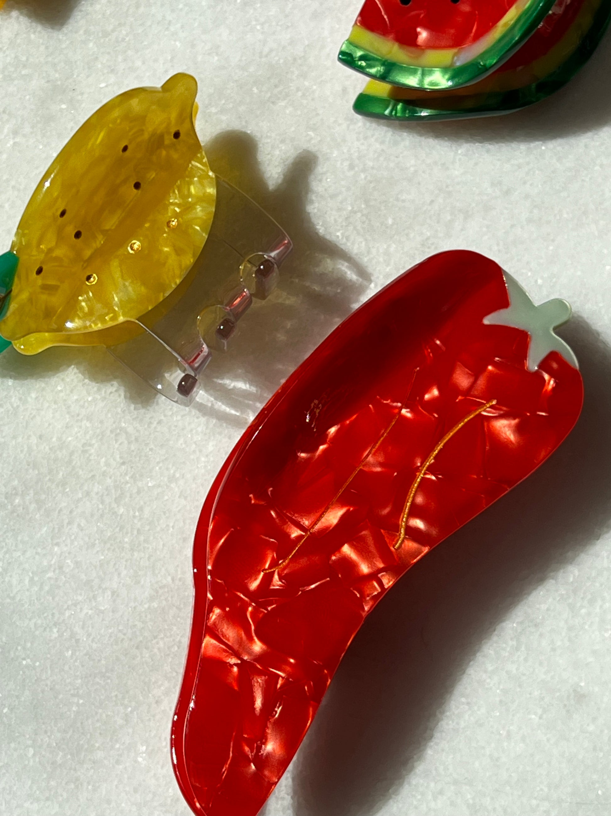 Esta pinza para el cabello de pimiento picante está hecha de acetato de la mejor calidad y diseñada para sujetar perfectamente tu cabello. Lo mejor para recortarte el cabello hacia atrás, es súper versátil y está lista para acompañarte en tu búsqueda de la Dolce Vita.