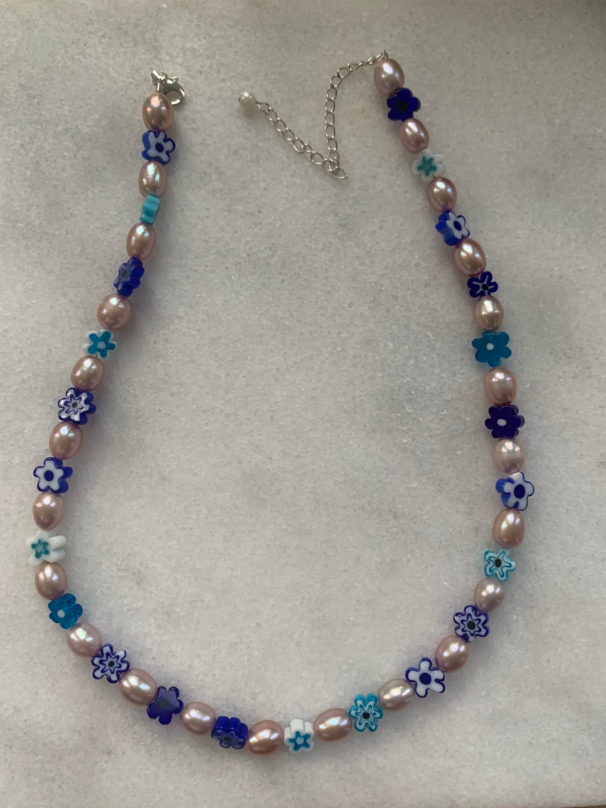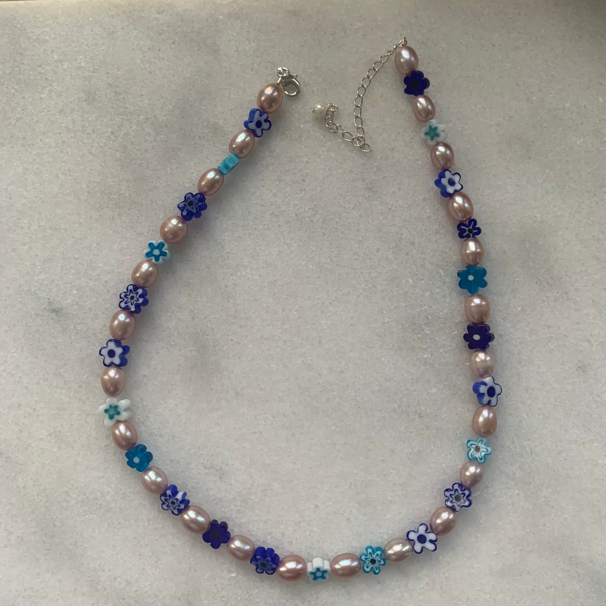 Perlas de agua dulce y cuentas millefiori de cristal con acabados en plata de ley.